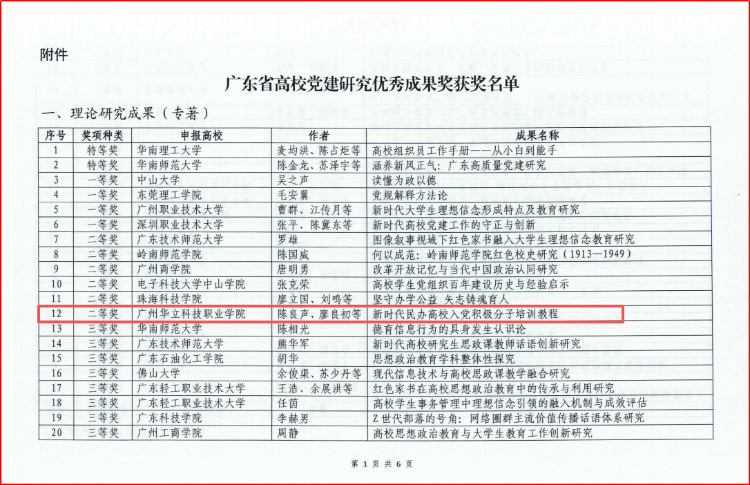 廣州華立科技職業(yè)學(xué)院榮獲廣東省高校黨建研究?jī)?yōu)秀成果獎(jiǎng)二等獎(jiǎng)