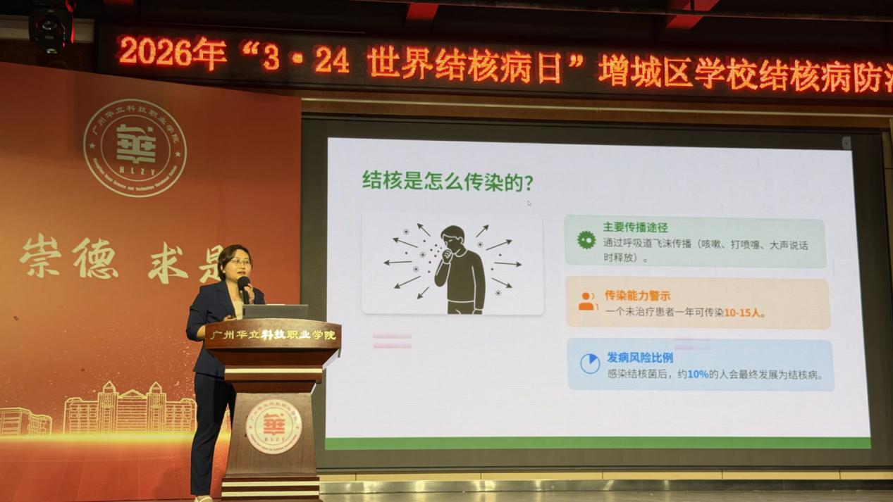 為深入貫徹落實國家關(guān)于結(jié)核病防治工作的部署要求,進(jìn)一步提升師生健康素養(yǎng),營造健康安全的校園環(huán)境,2026年3月23日下午15:00,廣州華立科技職業(yè)學(xué)院在圖書館八樓隆重舉行2026年“3·24世界結(jié)核病日”增城區(qū)學(xué)校結(jié)核病防治宣講活動。大會以“結(jié)核病預(yù)防”為主題,增城區(qū)疾控中心、廣州醫(yī)科大學(xué)附屬第四醫(yī)院、廣州市增城區(qū)增江街社區(qū)衛(wèi)生服務(wù)中心、廣東省華立技師學(xué)院、廣州市增城區(qū)樂眾社會工作服務(wù)中心及學(xué)校師生代表共同出席本次活動。