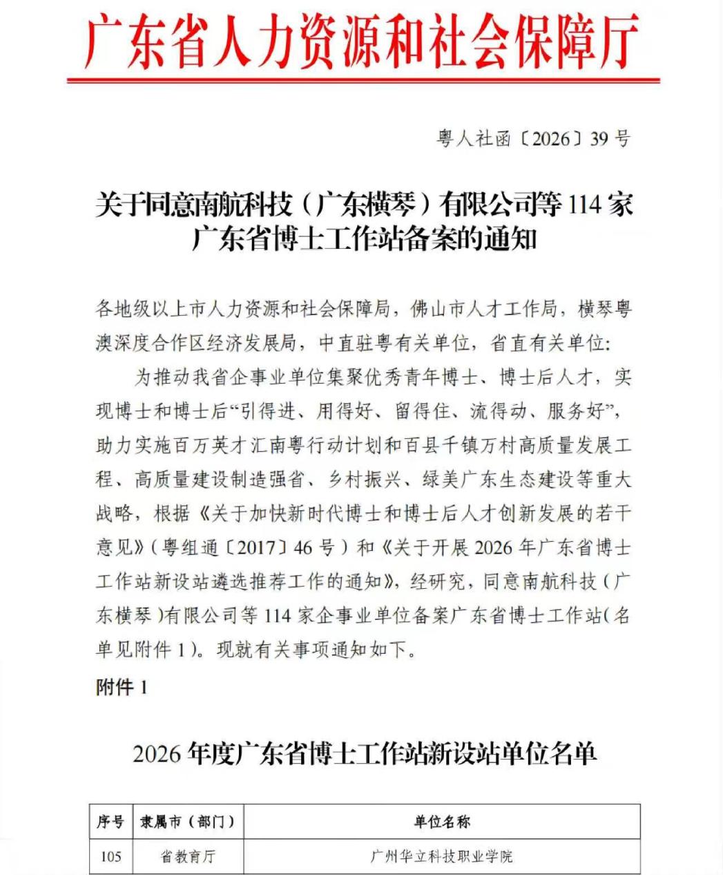 近日,廣東省人力資源和社會保障廳印發(fā)《關于同意南航科技(廣東橫琴)有限公司等114家廣東省博士工作站備案的通知》(粵人社函〔2026〕39號),廣州華立科技職業(yè)學院正式獲批設立廣東省博士工作站,標志著學校在高層次人才引育、科技創(chuàng)新平臺建設、產(chǎn)教融合深化發(fā)展等方面邁上新臺階。