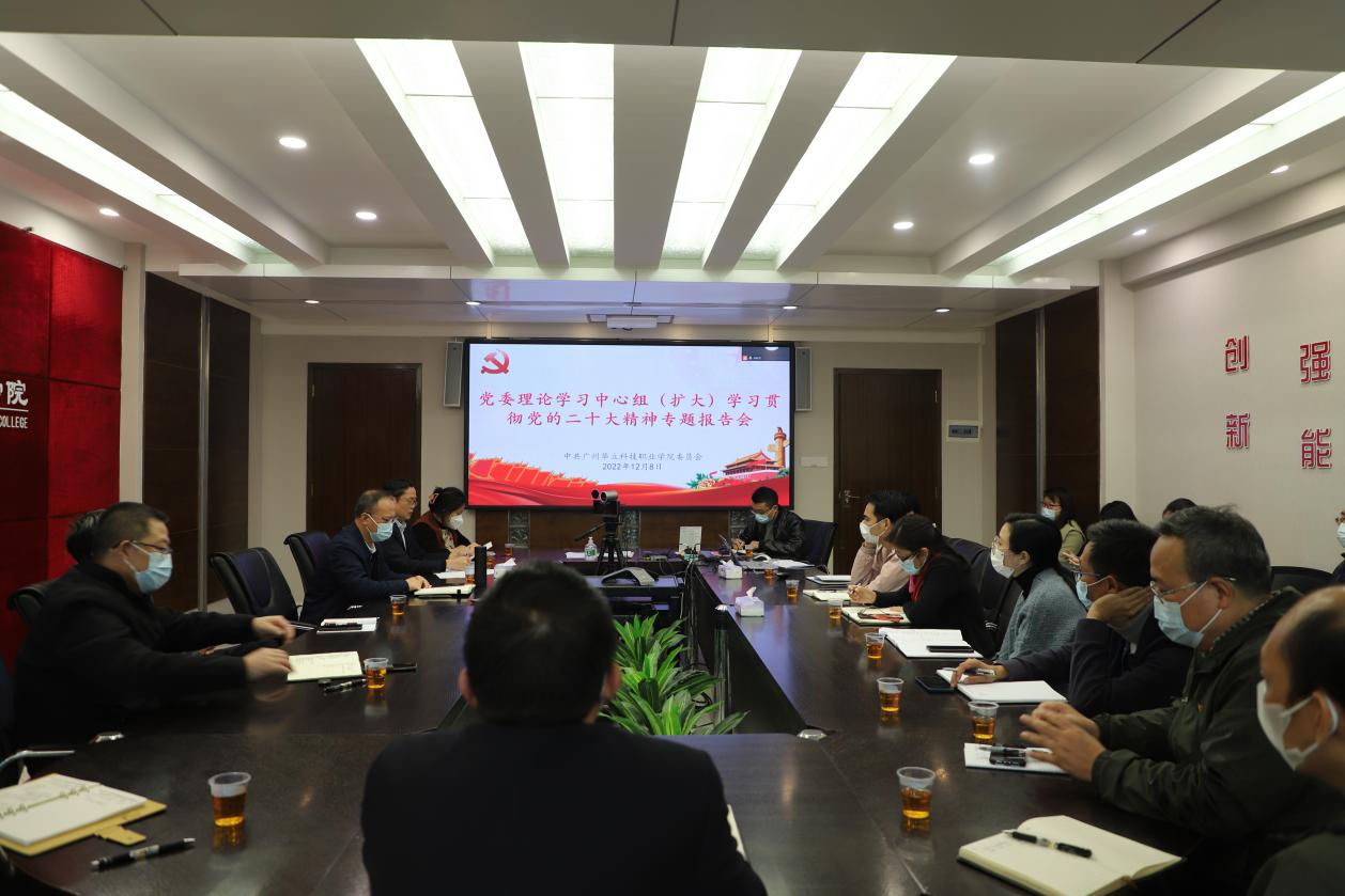 2022年12月8日下午,廣州華立科技職業(yè)學院黨委理論中心組(擴大)在行政樓305會議室舉行第二次學習貫徹黨的二十大精神專題報告會。學校黨委書記陳良聲,校長易健民,副書記、副校長高堯來,副校長陳顯強以及各黨總支、直屬黨支部負責人,全體思政教師、教師黨員代表參加了會議。會議由黨委辦公室主任孟允煌主持。我校云浮校區(qū)領(lǐng)導干部也通過視頻連線參加了本次專題學習。