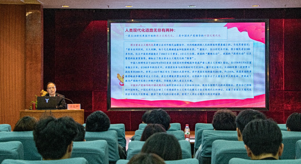 本次授課圍繞“中國式現(xiàn)代化的探索歷程、中國式現(xiàn)代化的基本內(nèi)涵、中國式現(xiàn)代化的本質(zhì)要求、中國式現(xiàn)代化的戰(zhàn)略支撐、大學(xué)生在新征程勇當(dāng)先鋒”五個方面展開。陳良聲書記以寬廣深邃的歷史觀,結(jié)合近百年來復(fù)雜的國際和國內(nèi)形勢,向同學(xué)們深入解讀了中國式現(xiàn)代化的發(fā)展歷程、主要特征、豐富內(nèi)涵和戰(zhàn)略支撐,并引用習(xí)近平總書記在與北大師生座談時發(fā)表的重要講話,勉勵同學(xué)們在實現(xiàn)中國式現(xiàn)代化新征程上挺膺擔(dān)當(dāng)、勇當(dāng)先鋒。一要愛國,忠于祖國,忠于人民;二要勵志,立鴻鵠志,做奮斗者;三要求真,求真學(xué)問,練真本領(lǐng);四要力行,知行合一,做實干家。