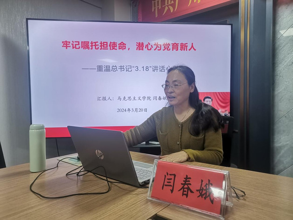 3月20日下午,專題報告會在G1棟314會議室舉行。學校黨委委員、黨辦主任劉宇赤教授、馬克思主義學院院長廖良初教授及全體思政課教師參會,何楚婷副教授主持會議。