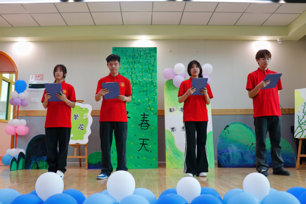 活動伊始,教育學院四位同學為到來的家長和在場的小朋友們表演了詩歌朗誦《春的詩行》。他們飽滿且富有情感的朗誦,仿佛為現(xiàn)場家長和小朋友們呈現(xiàn)出了春天生機勃勃的景象。志愿者同學表演結束后贏得了家長們陣陣掌聲。