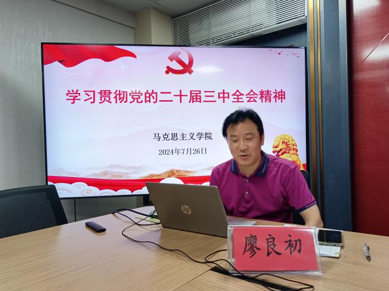 為全面學(xué)習(xí)貫徹黨的二十屆三中全會(huì)精神,把全會(huì)精神第一時(shí)間融入思政課教學(xué),7月26日,馬克思主義學(xué)院組織全體思政課教師在G1棟314會(huì)議室舉行“學(xué)習(xí)貫徹黨的二十屆三中全會(huì)精神”專(zhuān)題講座。學(xué)院年輕學(xué)者鄭晗斐老師結(jié)合自己的學(xué)習(xí)體會(huì),作專(zhuān)題輔導(dǎo),院長(zhǎng)廖良初教授主持。
