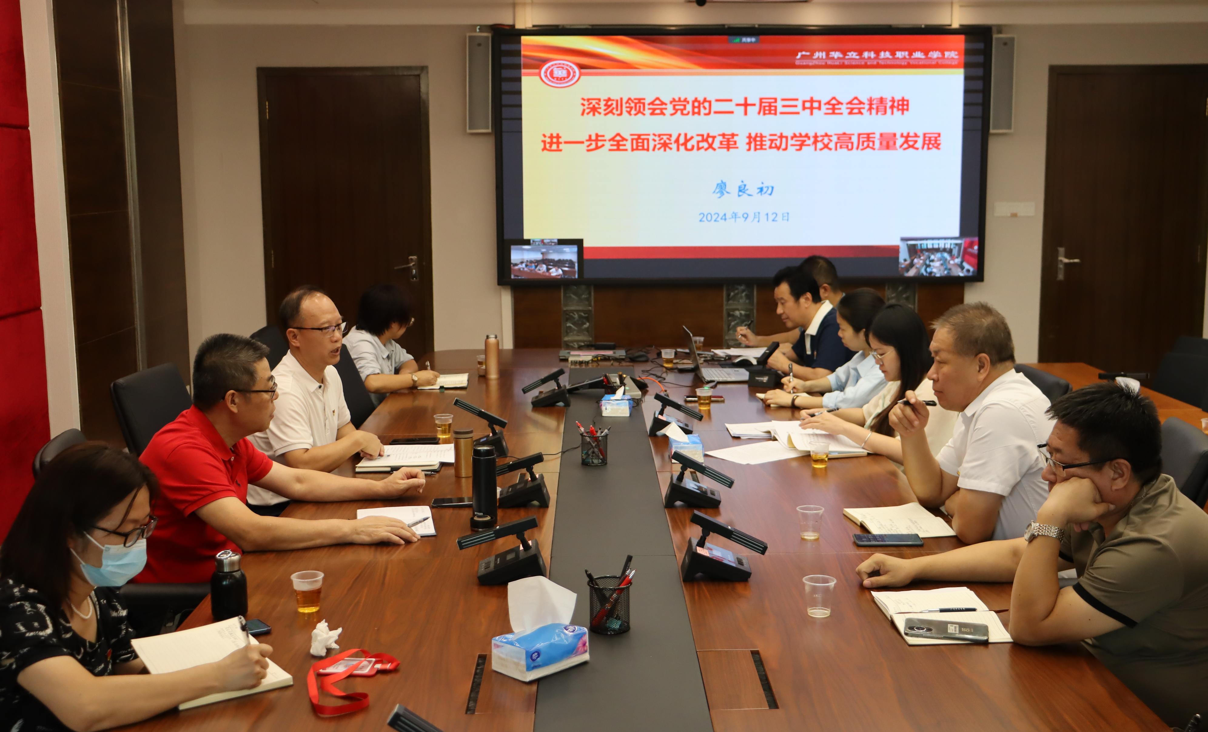 9月12日下午,我校在行政樓305會議室召開黨委理論學習中心組(擴大)學習會議,馬克思主義學院院長廖良初教授作題為《深刻領(lǐng)會黨的二十屆三中全會精神,進一步全面深化改革,推動學校高質(zhì)量發(fā)展》的專題報告。黨委書記陳良聲主持會議,學校領(lǐng)導、黨委委員、紀委委員以及黨委各部門、各二級黨組織的負責人參加學習會,云浮校區(qū)的相關(guān)領(lǐng)導通過視頻連線參加。