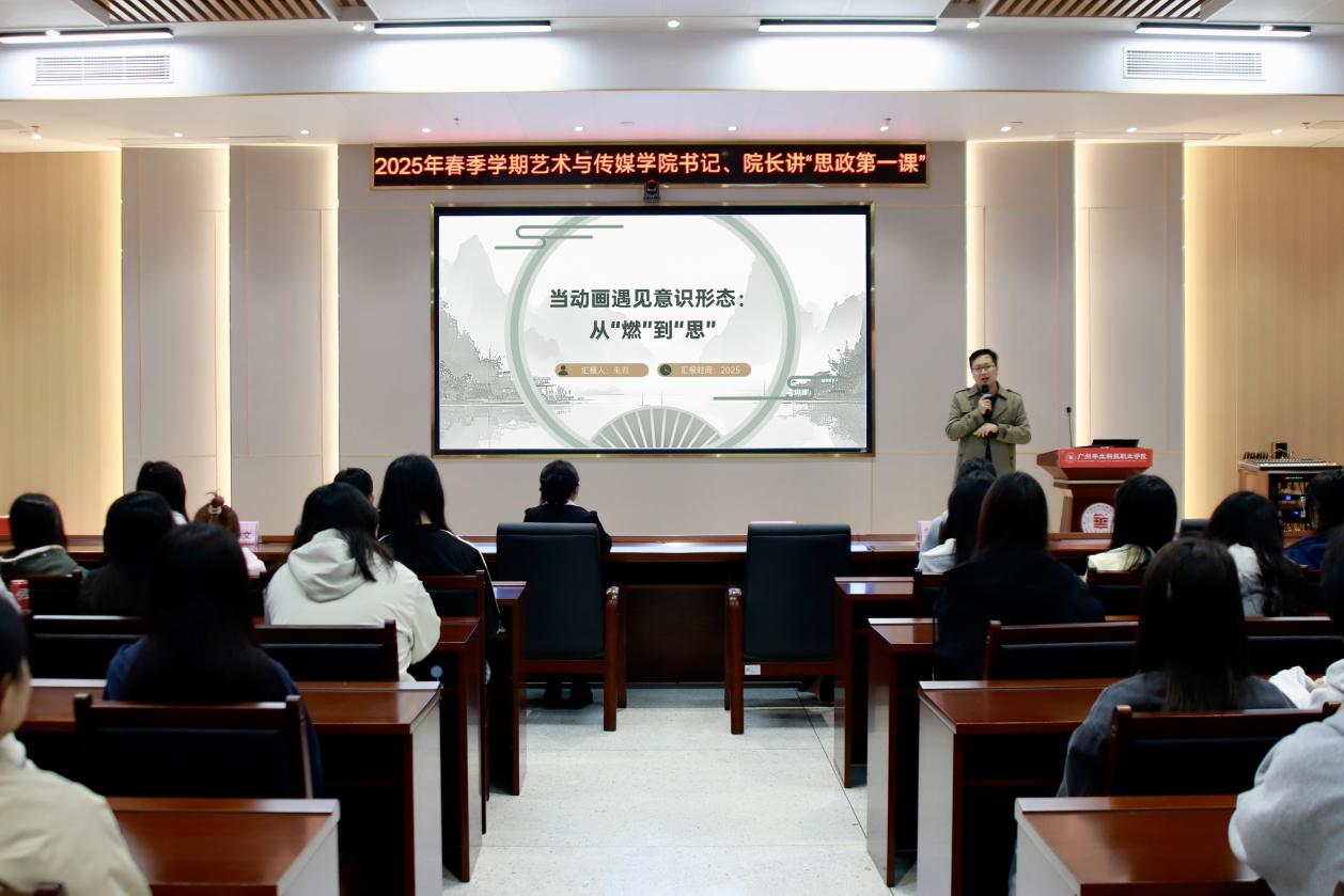 藝術與傳媒學院院長朱君以“當動畫遇見意識形態(tài):從‘燃’到‘思’”為主題,結(jié)合當下熱門動畫案例,引導學生感悟文化自信,生動的詮釋了什么是意識形態(tài),強化學生對中華優(yōu)秀傳統(tǒng)文化認同及家國情懷的認知。朱院長強調(diào),當代青年需從“燃”的表象深入至“思”的內(nèi)核,在文化自信中解碼民族精神密碼。