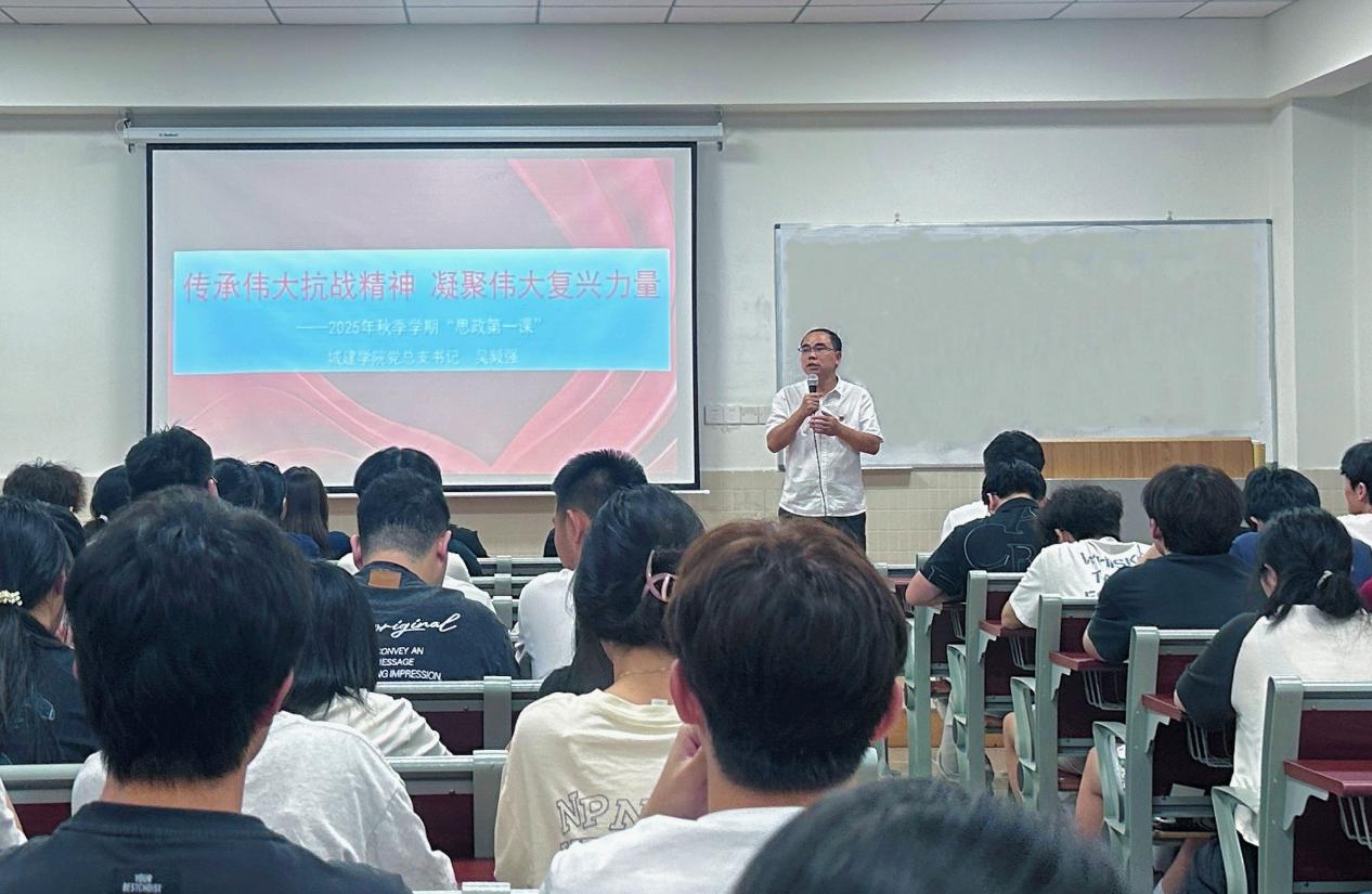 2025年10月14日,城建學(xué)院黨總支書(shū)記吳毅強(qiáng)在第二教學(xué)樓408教室,為24級(jí)、25級(jí)各專業(yè)學(xué)生代表講授主題為“傳承偉大抗戰(zhàn)精神 凝聚偉大復(fù)興力量”的“思政第一課”,引導(dǎo)青年學(xué)子從抗戰(zhàn)歷史中汲取精神力量,錨定民族復(fù)興使命。