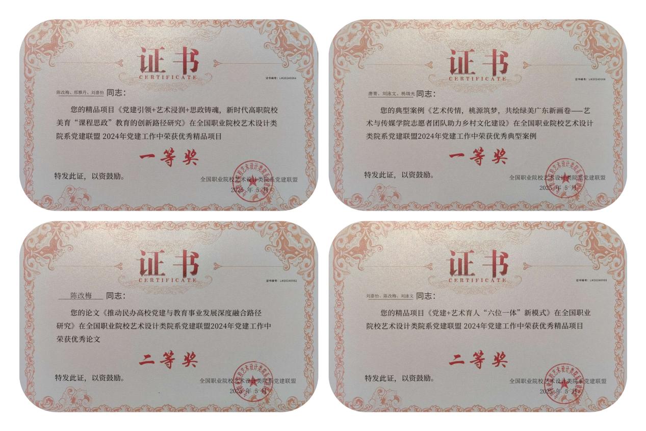 近日,全國職業(yè)院校藝術(shù)設(shè)計類院系黨建聯(lián)盟 2024 年黨建工作評選結(jié)果揭曉,廣州華立科技職業(yè)學(xué)院藝術(shù)與傳媒學(xué)院黨總支的工作得到了同行的充分肯定,在優(yōu)秀精品項目、優(yōu)秀典型案例、優(yōu)秀論文評比中喜獲一等獎2項、二等獎2項、三等獎3項,充分彰顯了我校藝術(shù)與傳媒學(xué)院黨總支在黨建引領(lǐng)高質(zhì)量發(fā)展、課程思政、藝術(shù)沁潤、社會服務(wù)、鄉(xiāng)村振興以及專業(yè)建設(shè)等方面工作的能力和水平。