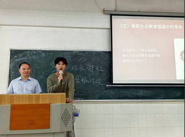 廖校長強調,職業(yè)教育是與普通教育同等重要的教育類型,是國民教育體系和人力資源開發(fā)的重要組成部分。高職畢業(yè)生占新增就業(yè)人口70%,制造業(yè)一線技術骨干80%來自高職,職業(yè)教育已成為教育強國的“半壁江山”,職業(yè)教育大有可為。在互動環(huán)節(jié),他提出“作為高職學生,你認為自己在教育強國中能扮演什么角色”等問題,引發(fā)學生深思。他引用習近平總書記的青年寄語:“青年一代有理想、有本領、有擔當,國家就有前途,民族就有希望”,鼓勵學生立大志、明大德、成大才,將個人成長融入國家發(fā)展。