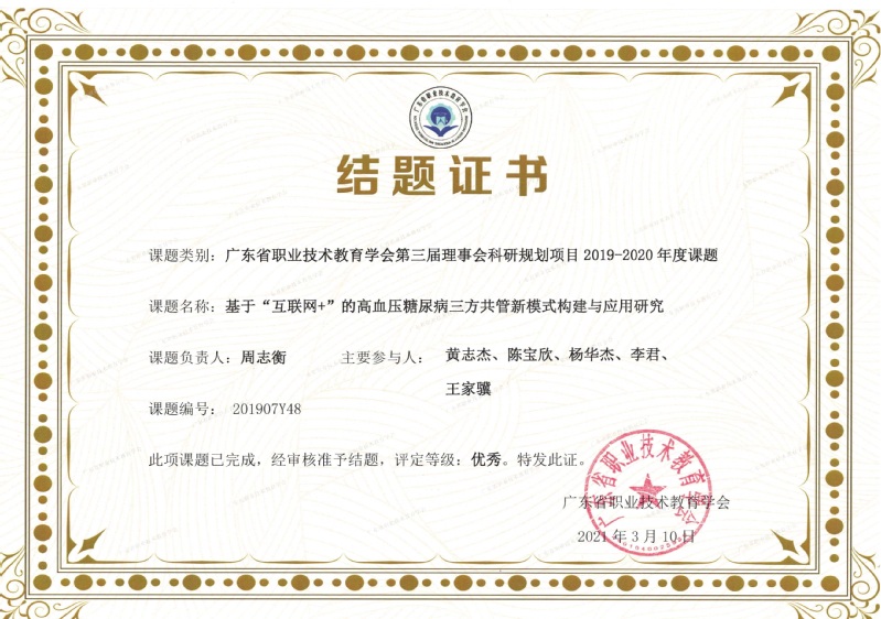 根據(jù)《廣東省職業(yè)技術(shù)教育學(xué)會(huì)第三屆理事會(huì)科研規(guī)劃項(xiàng)目2019-2020年度課題結(jié)題的通知》廣東省職業(yè)技術(shù)教育學(xué)會(huì)聘請(qǐng)專(zhuān)家結(jié)結(jié)題項(xiàng)目進(jìn)行了認(rèn)真評(píng)審,高職學(xué)院共83項(xiàng)課題順利結(jié)題。其中我校周志衡老師的課題《基于“互聯(lián)網(wǎng)+”的高血壓糖尿病三方共管新模式構(gòu)建與應(yīng)用研究》、王秀麗老師的課題《基于AI技術(shù)的大學(xué)英語(yǔ)“微課”的個(gè)性化設(shè)計(jì)與應(yīng)用研究》、王慶海老師的課題《關(guān)于體育美育課對(duì)高職院校中大學(xué)生人文素養(yǎng)提升的探究》、張哲老師的課題《非物質(zhì)文化遺產(chǎn)中粵繡的傳統(tǒng)圖形在現(xiàn)代設(shè)計(jì)中的傳承與應(yīng)用》等順利通過(guò)廣東省職業(yè)技術(shù)教育學(xué)會(huì)的結(jié)題評(píng)審,尤其是周志衡老師的課題結(jié)題評(píng)審結(jié)題為優(yōu)秀課題,具體名單見(jiàn)附件通知。