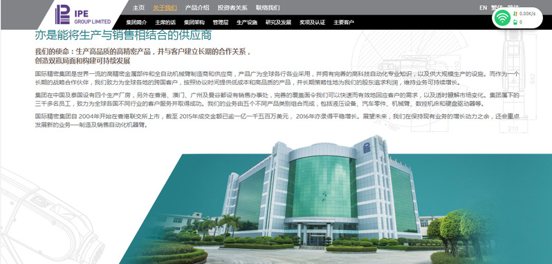 IPE集團(tuán) 廣州市新豪精密五金制品有限公司 INTEGRATED PRECISION ENGINEERING CO.LTD CHINA 地址:廣州增城新塘鎮(zhèn)岳湖村岳湖大道 網(wǎng)址: http://www.ipegroup.com 郵箱:hr-adam@ipecn.com IPE 集團(tuán)是一家以生產(chǎn)應(yīng)用于汽車、電腦、光纖等方面的高精密五金零件的大型跨國(guó)上市公司,集團(tuán)在香港、泰國(guó)、廣東設(shè)有公司、工廠;在澳門、歐洲設(shè)有辦事處。公司先后通過了ISO9001:2000,QS9000以及ISO/TS16949國(guó)際質(zhì)量認(rèn)證,是一家管理先進(jìn),資金雄厚,以高質(zhì)量和高信譽(yù)傲視精密五金市場(chǎng)領(lǐng)域的實(shí)業(yè)集團(tuán)。根據(jù)市場(chǎng)需求,我公司在廣州增城新建IPE新豪工業(yè)園,現(xiàn)有員工3000多人,工業(yè)園占地面積167,000平方米,花園式的廠房,高標(biāo)準(zhǔn)的食宿條件,完善的娛樂設(shè)施,充分的培訓(xùn)機(jī)會(huì),規(guī)范的晉升平臺(tái)充分體現(xiàn)了公司重視人才,以人為本的企業(yè)文化。