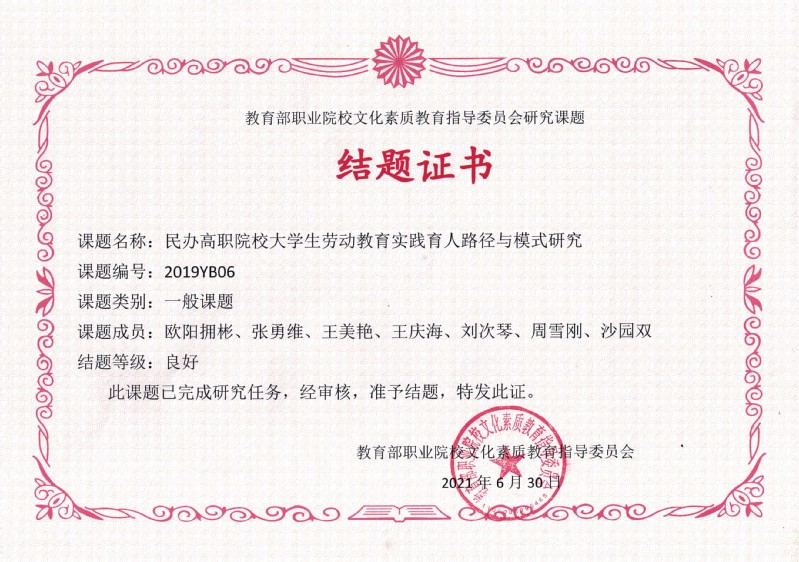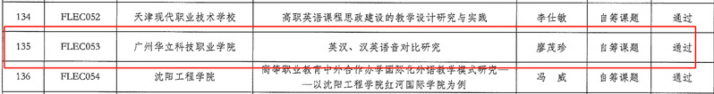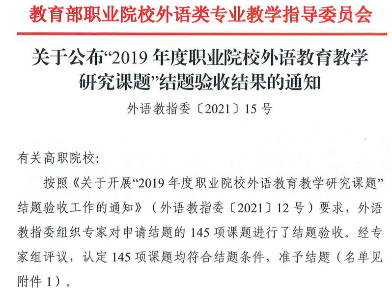 根據(jù)教育部職業(yè)院校文化素質(zhì)教育指導委員會以及教育部職業(yè)院校外語類專業(yè)教學指導委員會相關結(jié)題通知要求,我校分別對歐陽擁彬老師主持的2019年度職業(yè)院校文化素質(zhì)教育研究課題《民辦高職院校大學生勞動教育實踐育人路徑與模式研究》以及廖茂珍老師主持的2019年度職業(yè)院校外語教育教學研究課題《英漢、漢英語音對比研究》開展課題結(jié)題工作,并按時提交結(jié)題材料。經(jīng)教指委專家評審,現(xiàn)兩項教育部教指委課題均順利通過結(jié)題驗收。同時,本年度順利結(jié)題的教指委項目還有歐陽擁彬老師主持的2018年度廣東省高職教育教學管理委員會教育教學改革項目《基于互聯(lián)網(wǎng)+的高職學生事務管理模式研究》、陳茜老師主持的廣東省高職教育外語教學指導委員2018年教育教學改革項目《廣東省民辦高職院校商務英語專業(yè)跨境電商亞馬遜平臺運營人才培養(yǎng)初探》以及廖茂珍老師主持的廣東省高職教育外語教學指導委員2018年教育教學改革項目《基于校外實踐教學生態(tài)體系管理系統(tǒng)對商務英語專業(yè)人才培養(yǎng)過程影響實踐研究》。特此祝賀。