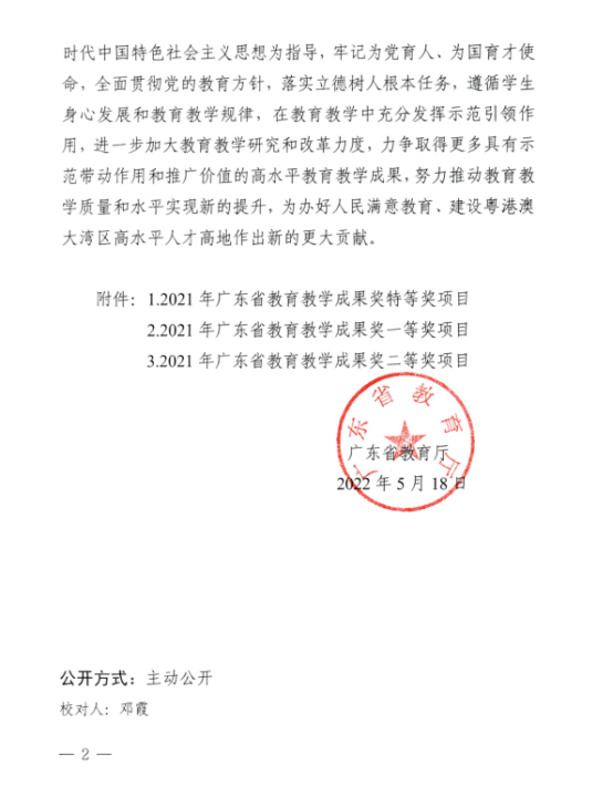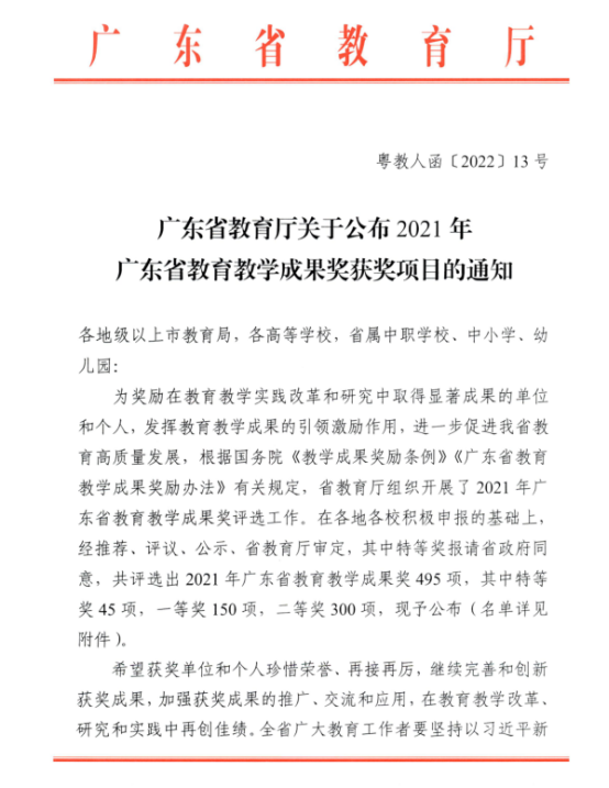 根據(jù)《廣東省教育廳關(guān)于公布2021年廣東省教育教學(xué)成果獎(jiǎng)獲獎(jiǎng)項(xiàng)目的通知》(粵教人函〔2022〕13號(hào)),我校財(cái)經(jīng)學(xué)院團(tuán)隊(duì)的教學(xué)成果項(xiàng)目《高職財(cái)會(huì)類專業(yè)校企“共建共育共成長(zhǎng)”人才培養(yǎng)模式的探索與實(shí)踐》獲2021年廣東職業(yè)教育教學(xué)成果獎(jiǎng)二等獎(jiǎng)項(xiàng)目。