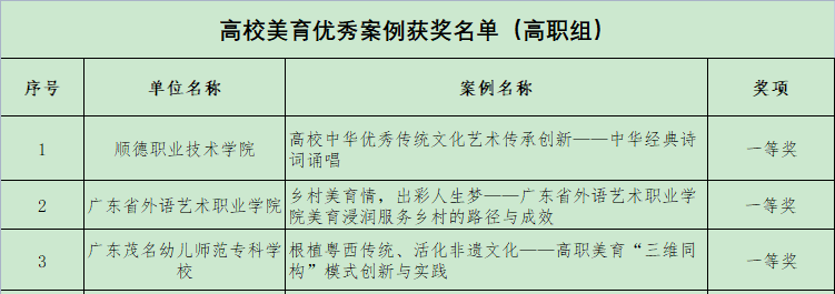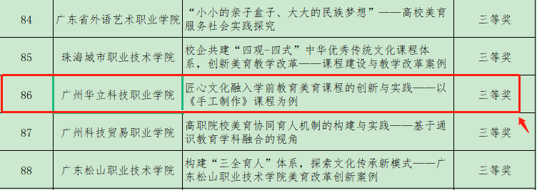 此次獲獎名單分本科組及??平M,我校申報的美育案例《匠心文化融入學(xué)前教育美育課程的創(chuàng)新與實(shí)踐——以<手工制作>課程為例》獲得??平M三等獎。