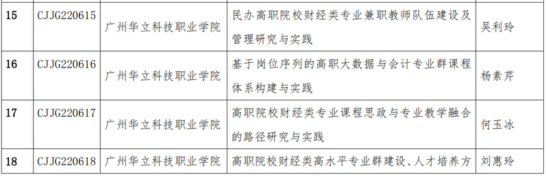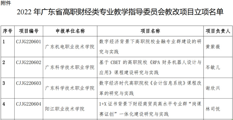 根據(jù)廣東省高等職業(yè)院校財(cái)經(jīng)類專業(yè)教學(xué)指導(dǎo)委員會(huì)發(fā)布的《關(guān)于組織申報(bào)2022年度財(cái)經(jīng)類專業(yè)教育教學(xué)改革項(xiàng)目的通知》(粵高職財(cái)經(jīng)教指委〔2022〕3號(hào))規(guī)定,給個(gè)人申報(bào)、學(xué)校推薦、資格審查、專家評(píng)審和公示等環(huán)節(jié),廣東省高職財(cái)經(jīng)類專業(yè)教學(xué)指導(dǎo)委員會(huì)共立項(xiàng)了39個(gè)教改項(xiàng)目,其中我校吳利玲、楊素芹、何玉冰、劉惠玲等4位教師的項(xiàng)目成功立項(xiàng)。