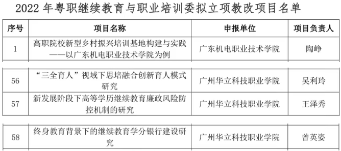 廣東省職業(yè)院校繼續(xù)教育與職業(yè)培訓(xùn)工作指導(dǎo)委員會(huì)今年9月啟動(dòng)了2022年度教學(xué)改革項(xiàng)目的申報(bào)工作,經(jīng)各高職院校自主申報(bào)、形式審查、專家評(píng)審等程序,現(xiàn)予以公示。根據(jù)公示結(jié)果,我校吳利玲、王澤秀、曾英姿三位老師的項(xiàng)目擬公示立項(xiàng)建設(shè)。