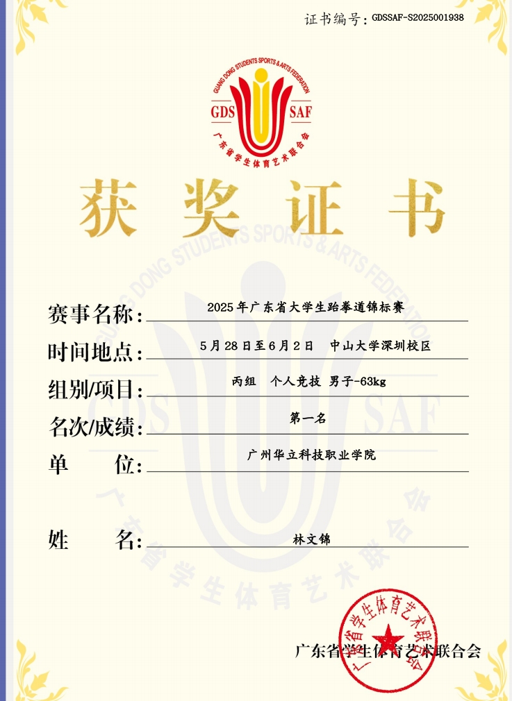 廣東省大學(xué)生跆拳道錦標(biāo)賽 男子(63kg)項目第一名