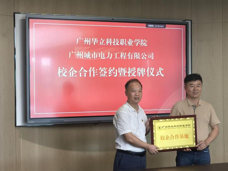 交流結(jié)束后,電力與智能制造學(xué)院院長褚玉峰與廣州城市電力工程有限公司總裁沈桂渠續(xù)簽了校企合作協(xié)議書,陳良聲書記為企業(yè)授了“校企合作基地”牌子。