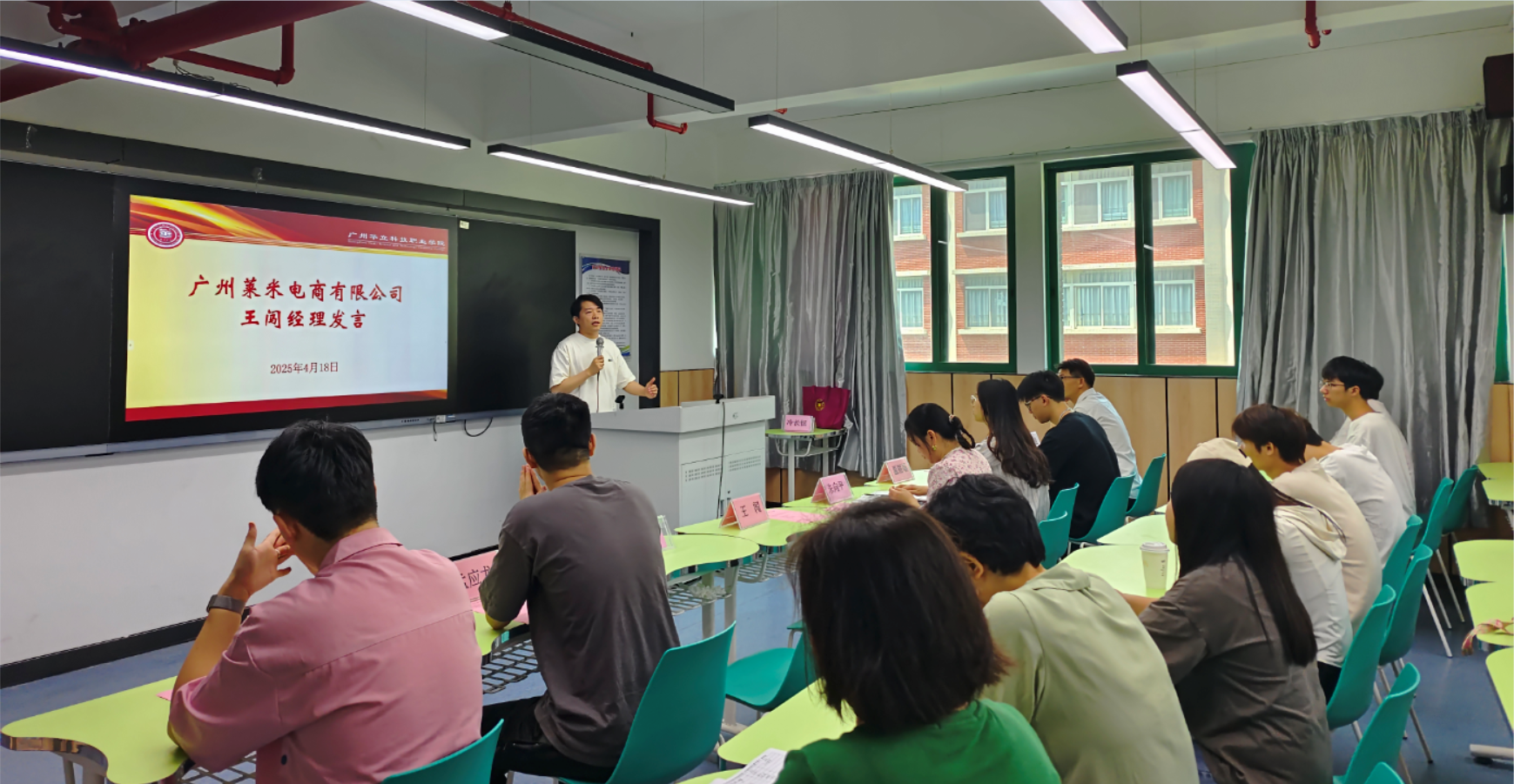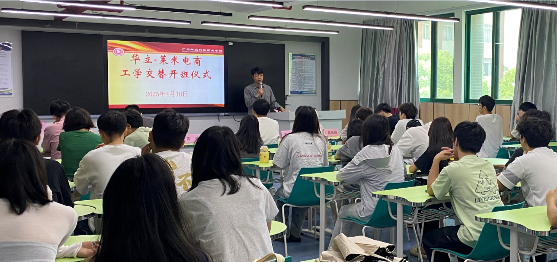 2025 年 4 月 18 日上午 10:30,“華立 - 萊米電商” 工學交替班開班儀式在西三 211 教室盛大舉行。廣州華立科技職業(yè)學院經(jīng)濟管理學院副院長朱向平、就業(yè)主任陳湛通、電商系主任黃英,劉淑琴、汪蔚等電商專業(yè)群骨干教師,攜手廣州萊米電商有限公司王闖經(jīng)理、相關(guān)項目的企業(yè)導師及工學交替班學生,共同開啟校企協(xié)同育人新篇章。