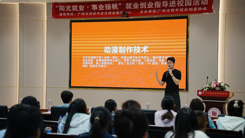 儀式結(jié)束后,活動進入陽光就業(yè)·事業(yè)揚帆——“數(shù)藝世界就業(yè)創(chuàng)業(yè)經(jīng)驗分享”主題講座環(huán)節(jié)。黃龍城項目總監(jiān)結(jié)合數(shù)字藝術(shù)行業(yè)的現(xiàn)狀與發(fā)展趨勢,分享了寶貴的職場經(jīng)驗與創(chuàng)業(yè)心得。他用生動的案例和實用的建議,為在場同學分享如何制作一部動漫電影。在互動環(huán)節(jié),同學們踴躍提問,與企業(yè)專家進行了深入的交流。