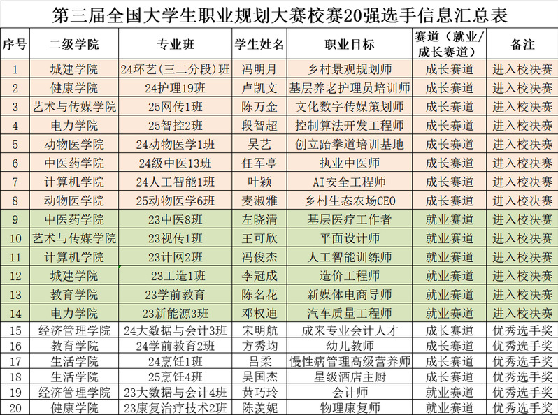 自2025年10月活動開展至今,根據(jù)教育部職規(guī)賽管理平臺報名數(shù)據(jù)顯示,我校共計報名人數(shù)為21173人,其中成長賽道15991人,就業(yè)賽道5182人,報名率接近90%。各二級學(xué)院優(yōu)秀學(xué)生作品經(jīng)過各院賽挑選和學(xué)校校賽初賽評選,最終24環(huán)藝(三二分段)班馮明月等20名同學(xué)優(yōu)秀作品進入校賽20強,同時成長賽道前8名和就業(yè)賽道前6名同學(xué)將參加12月4日學(xué)校校賽現(xiàn)場PK賽一、二、三等獎的角逐?,F(xiàn)將第三屆全國大學(xué)生職業(yè)規(guī)劃大賽廣州華立科技職業(yè)學(xué)院校賽20強選手名單及進入校決賽的14強選手名單公示如下,公示時長5個工作日。公示期內(nèi)如有異議可與學(xué)校校賽組委會(就業(yè)指導(dǎo)中心)反饋真實情況。