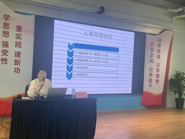 隨后,人事處張苑華副科長、王曉珍副處長及阮穎怡副科長依次介紹了人事管理相關(guān)制度,包括薪酬福利、五險一金、人才引進落戶、居住證明、OA系統(tǒng)使用、教師崗前培訓、教師資格證認定、繼續(xù)教育等相關(guān)政策。
