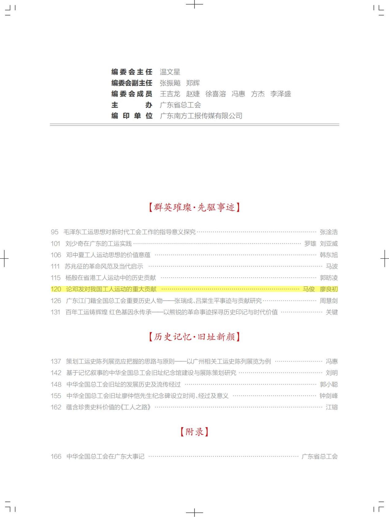 為慶祝中華全國總工會成立100周年,廣東省總工會發(fā)起了“百年工運(yùn)·粵工輝煌”主題征文活動。我校教師積極參與,14篇稿件獲推薦參加省總工會評選。在全省2000多篇征文中,共27篇入選《中華全國總工會在廣東——廣東省總工會“慶祝中華全國總工會成立100周年”主題專刊》,可謂“百里挑一”。其中我校馬俊教授、廖良初教授征文《論鄧發(fā)對我國工人運(yùn)動的重大貢獻(xiàn)》獲“優(yōu)秀征文”,刊登在此主題??稀晌蛔髡邚?qiáng)調(diào):“今年是中華全國總工會成立100周年,在這個(gè)特別值得紀(jì)念的日子里,我們更加懷念為中華全國總工會的成立,為中國新民主主義革命的勝利,為中國人民的解放和中華民族的獨(dú)立作出了杰出貢獻(xiàn)的老一輩無產(chǎn)階級革命家?!?/span>