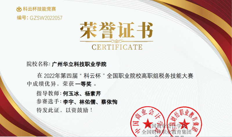 學生參加“科云杯”全國職業(yè)院校稅務(wù)技能大賽獲得一等獎