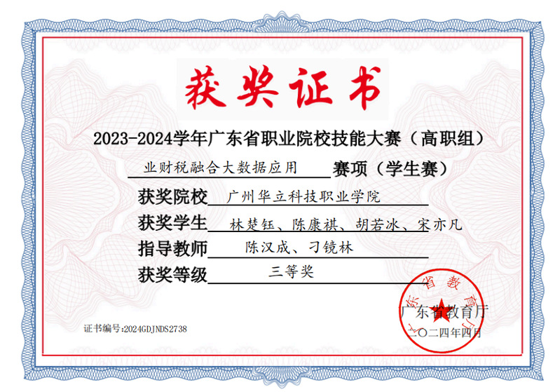 學生參加省級技能大賽“業(yè)財稅融合大數(shù)據(jù)應(yīng)用” 賽項獲得三等獎