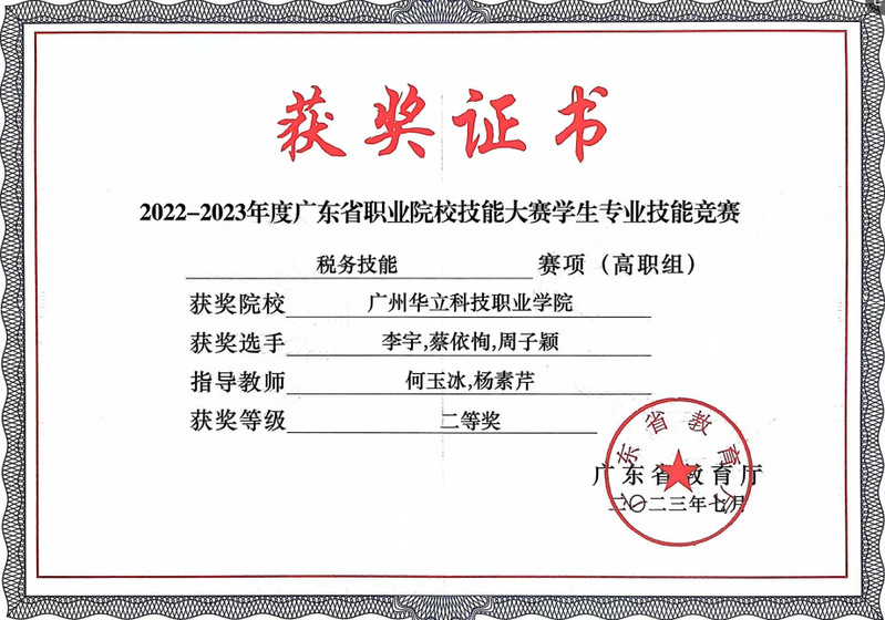 學生參加省級技能大賽“稅務(wù)技能” 賽項獲得二等獎