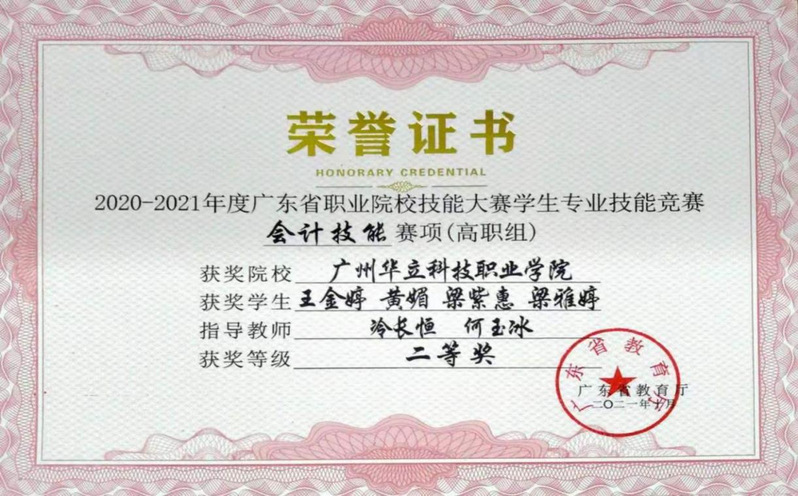 冷長恒、何玉冰老師指導學生參加省級職業(yè)技能(會計技能)競賽獲得二等獎