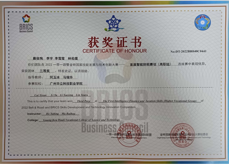何玉冰老師指導(dǎo)學(xué)生參加2022年金磚國(guó)家技能大賽(智能財(cái)稅)獲得三等獎(jiǎng)