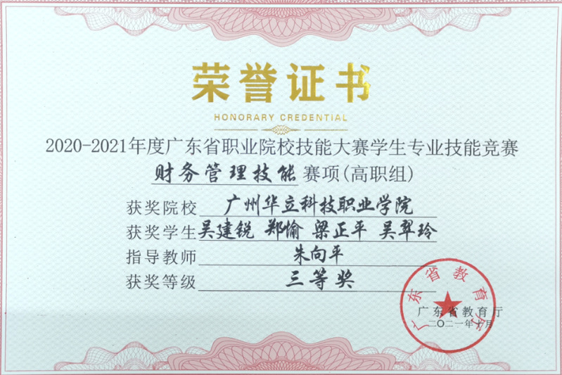 學(xué)生參加省級(jí)技能大賽財(cái)務(wù)管理技能” 賽項(xiàng)獲得三等獎(jiǎng)