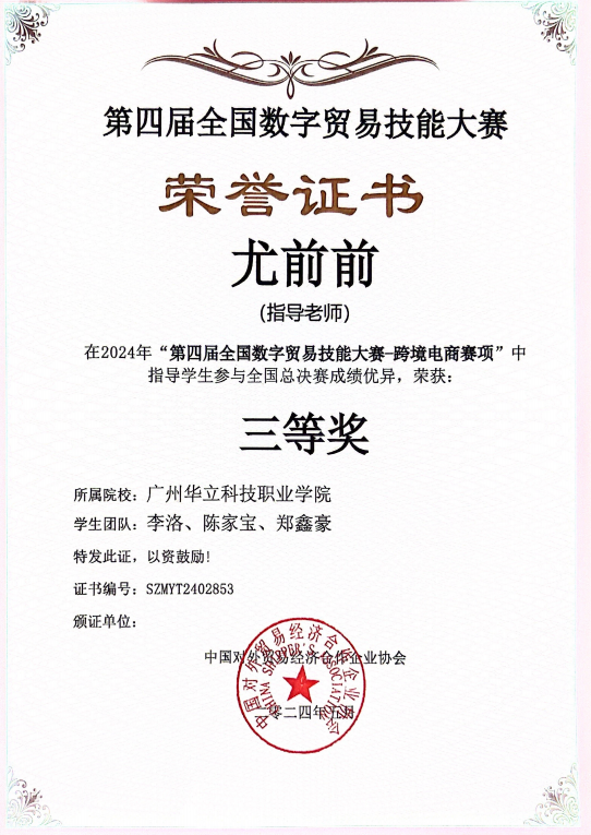 2024年“第四屆全國(guó)數(shù)字貿(mào)易技能大賽-跨境電商賽項(xiàng)”全國(guó)總決賽三等獎(jiǎng)