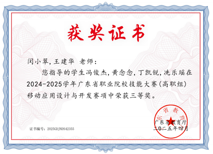 指導(dǎo)學(xué)生比賽獲獎(jiǎng)多項(xiàng),包括省職業(yè)技能大賽、挑戰(zhàn)杯、2025-帶一路暨金磚國家技能發(fā)展與技術(shù)創(chuàng)新大賽、廣東省大學(xué)生計(jì)算機(jī)設(shè)計(jì)大賽、中國機(jī)器人及人工智能大賽、華為ICT大賽、藍(lán)橋杯、大唐杯等。