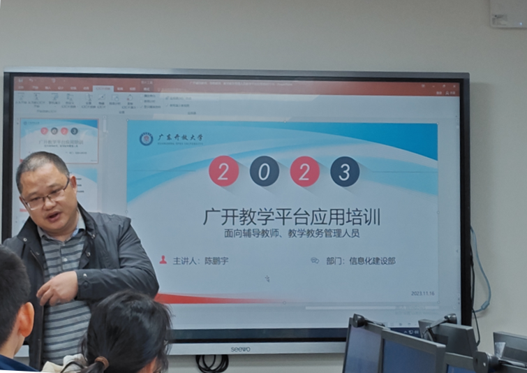 在培訓(xùn)會(huì)議中,廣開(kāi)信息建設(shè)部陳鵬宇老師給各校外教學(xué)點(diǎn)的老師演示教學(xué)平臺(tái)的基本功能與使用指南、教務(wù)管理端用戶注冊(cè)與輔導(dǎo)教師授權(quán)等功能的操作,并解答參加培訓(xùn)的各校外教學(xué)點(diǎn)老師提出的相關(guān)問(wèn)題。