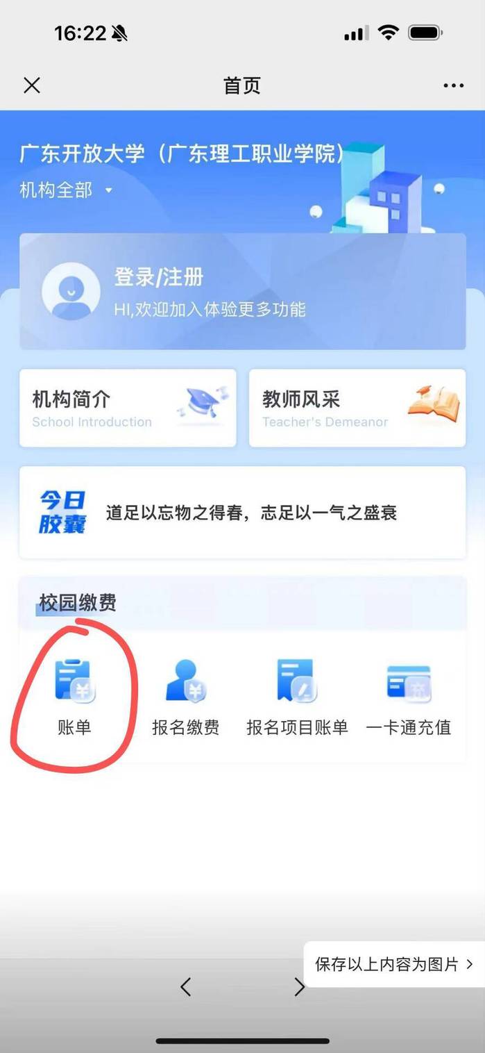 學(xué)生關(guān)注學(xué)校微信公眾號“廣東開放大學(xué)”--→“微招生”--→“學(xué)生繳費(fèi)”