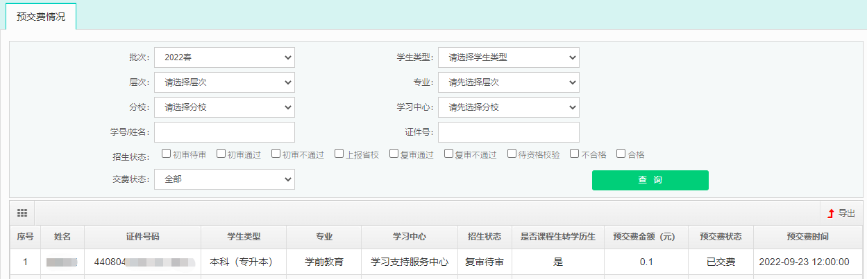 學(xué)生繳費(fèi)完成后,可以在預(yù)交費(fèi)情況菜單中查詢繳費(fèi)結(jié)果,包括預(yù)交費(fèi)金額、預(yù)交費(fèi)狀態(tài)以及預(yù)交費(fèi)時(shí)間,并可導(dǎo)出報(bào)表數(shù)據(jù)。(如圖2)