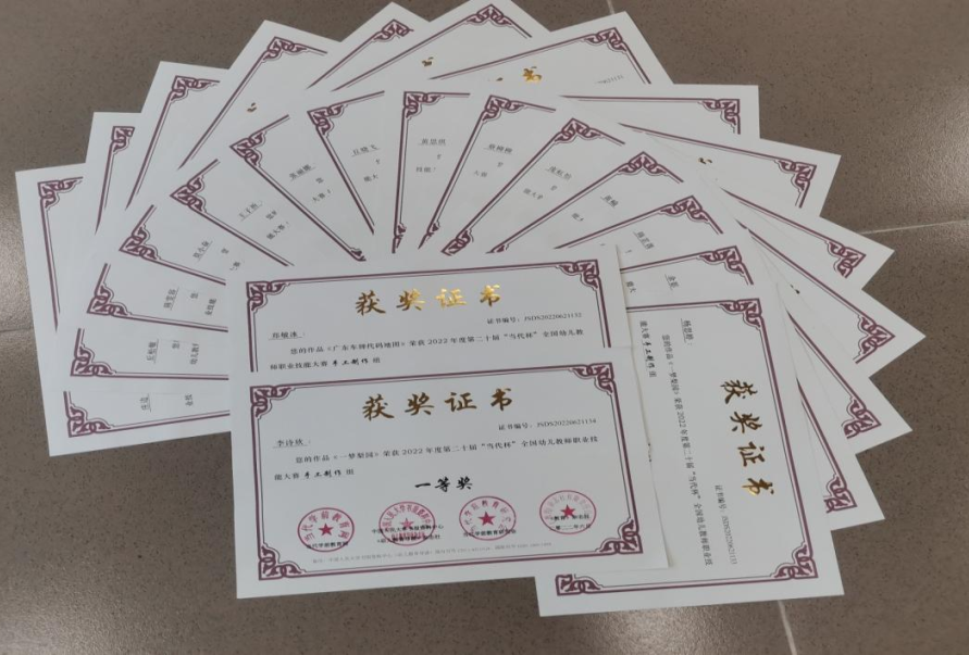 本次大賽主題為“創(chuàng)新,源于對教育的感悟”,旨在挖掘教師在教案、說課稿、活動計(jì)劃、觀察記錄、教育隨筆、案例分析、論文、環(huán)境創(chuàng)設(shè)、手工制作、玩教具制作、課件PPT、故事講述、繪畫、兒歌彈唱、舞蹈等方面的作品積累與創(chuàng)意才能。以賽促教、以賽促學(xué)、以賽促改、以賽促建。結(jié)合學(xué)校學(xué)前教育人才培養(yǎng)方案,學(xué)校領(lǐng)導(dǎo)高度重視本次大賽,確立了以院長為領(lǐng)隊(duì)、學(xué)前骨干教師為指導(dǎo)、教學(xué)秘書統(tǒng)籌協(xié)調(diào)、學(xué)生廣泛報(bào)名參賽的工作實(shí)施方案。強(qiáng)調(diào)以此次大賽為契機(jī),以育人強(qiáng)能為重點(diǎn),不斷強(qiáng)化學(xué)生“崗課賽證”相融通的專業(yè)技術(shù)技能訓(xùn)練。經(jīng)過三個(gè)月的艱苦訓(xùn)練和精心打磨,作品《一夢梨園》、《廣東車牌代碼地圖》榮獲一等獎(jiǎng),作品《北京冬奧2022》、《藍(lán)鯨》、《疫情后的春天》、《動物園》、《大班科學(xué)活動我愛吹泡泡》、《粉刷匠》、《森系小屋》榮獲二等獎(jiǎng)的;作品《幼兒防溺水》、《致敬大白》、《飛天逐夢》、《小豬減肥記》、《賣報(bào)歌》、《五彩公雞打鳴》、《狼和小羊》;優(yōu)秀獎(jiǎng)《烏云笑了》、《好媽媽》、《小熊不刷牙》榮獲三等獎(jiǎng),姚瑩瑩老師獲得全國促進(jìn)幼兒教師專業(yè)化優(yōu)秀指導(dǎo)獎(jiǎng)。碩果累累!此次大賽實(shí)現(xiàn)了學(xué)生自我設(shè)計(jì)、自我創(chuàng)新和自我提升的參賽體驗(yàn)及目標(biāo)。