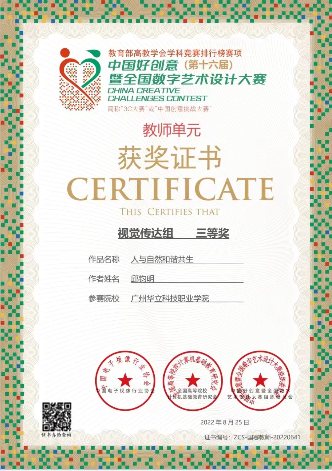 科研項目結碩果,國賽也傳來捷報。第16屆中國好創(chuàng)意暨全國數字藝術設計大賽上,教育學院邱鈞明老師的作品“人與自然和諧共生”獲得了國賽單元視覺傳達組三等獎和個人突出貢獻獎!