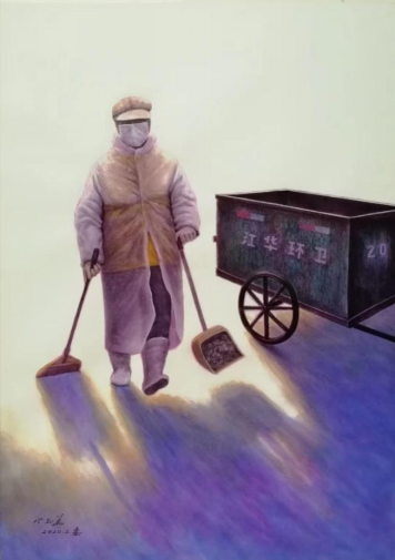疫情當(dāng)前的一個(gè)早晨,正在清潔打掃的環(huán)衛(wèi)工人堅(jiān)守在普通的勞動(dòng)崗位。畫家平實(shí)而細(xì)致地描繪了這個(gè)場(chǎng)景。