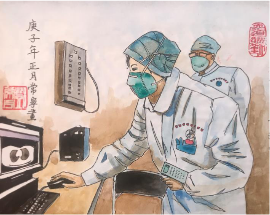 祥和美麗的白衣天使正戰(zhàn)斗在抗疫第一線,畫面簡潔單純,造型淡雅傳神。