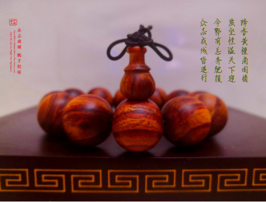 黃花梨手串構(gòu)成堅(jiān)實(shí)穩(wěn)定的三角造型,俯瞰又形成同心圓,寓意眾志成城,攜手抗疫。