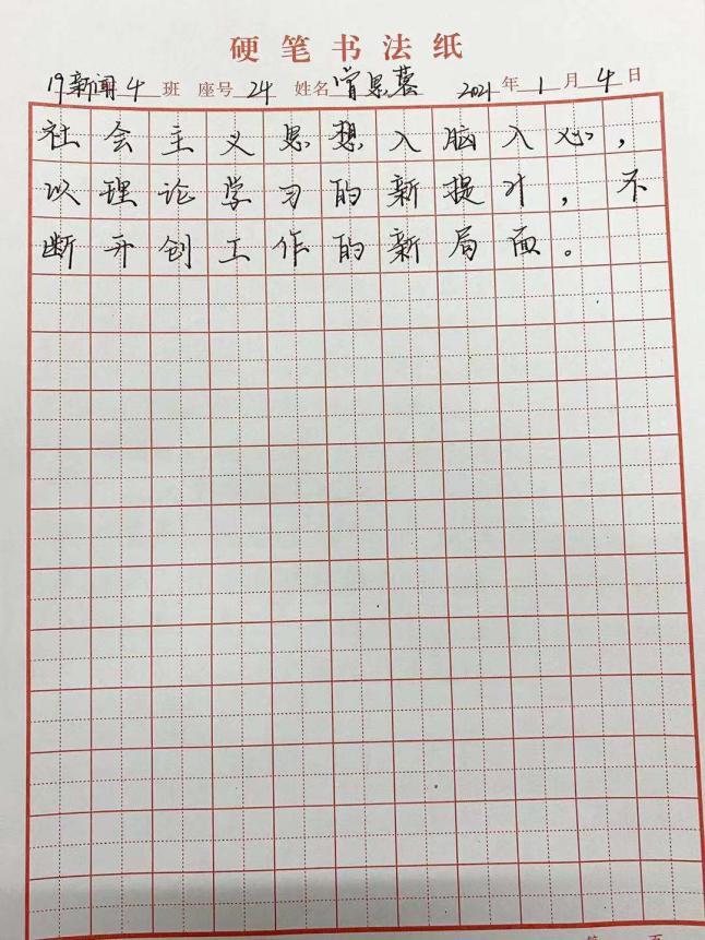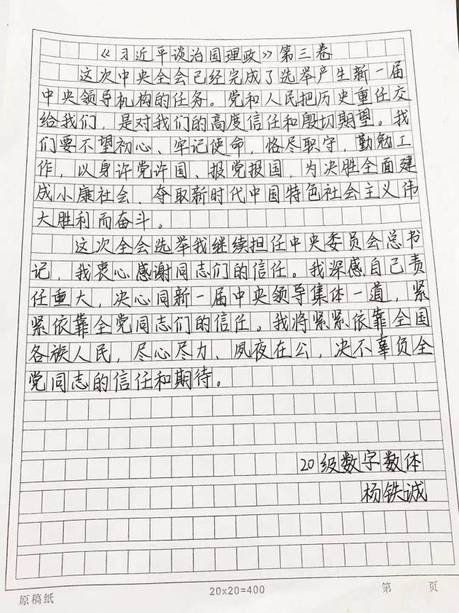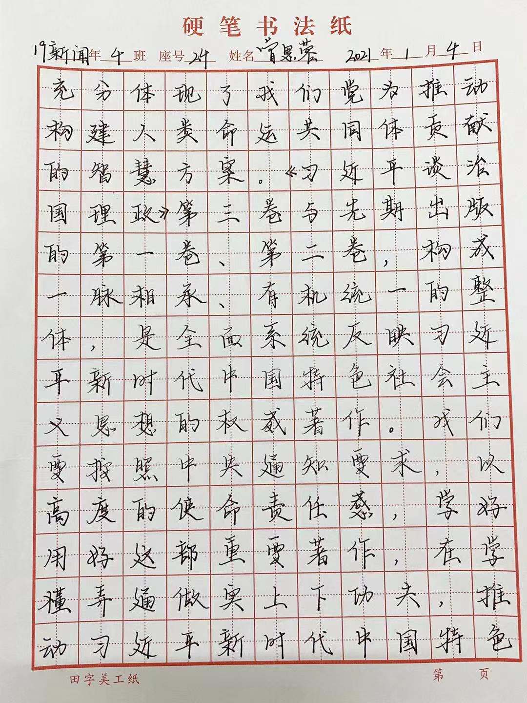 于2020年12月29日舉行藝術(shù)與傳媒學(xué)院第一屆硬筆書法比賽。為了幫助同學(xué)們更加深入領(lǐng)會(huì)掌握習(xí)近平新時(shí)代中國特色社會(huì)主義思想的科學(xué)體系,進(jìn)一步增強(qiáng)學(xué)思想、悟思想、用思想的自覺性和堅(jiān)定性,將《學(xué)習(xí)習(xí)近平談治國理政》第三卷的內(nèi)容作為比賽的內(nèi)容。