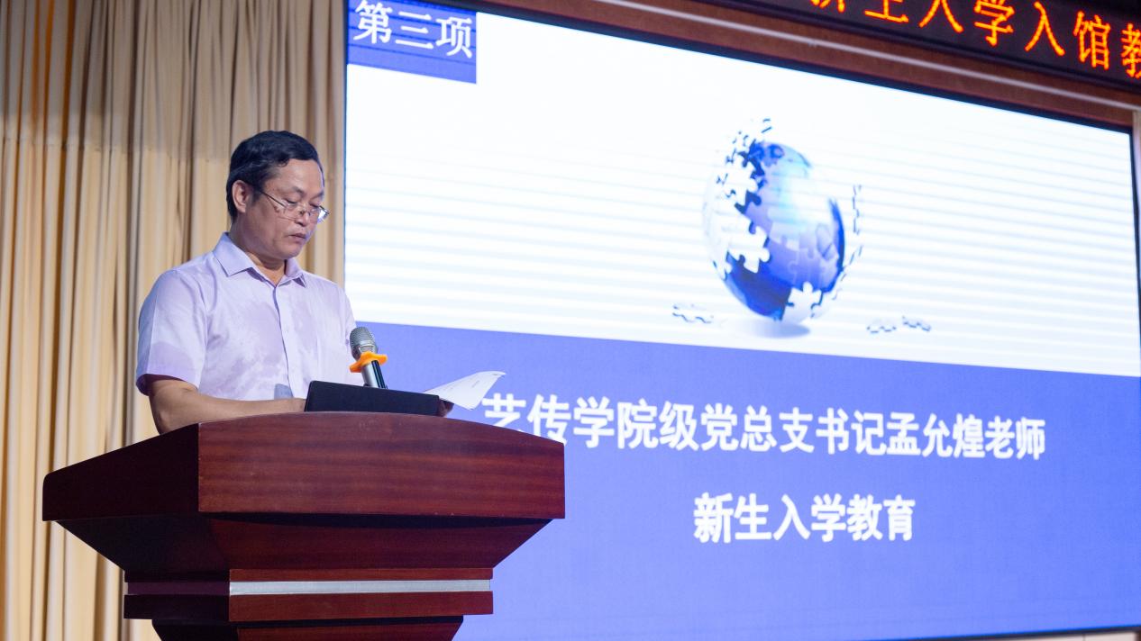 大會分為5個流程,首先由藝術(shù)與傳媒學(xué)院黨總支書記孟允煌院長發(fā)言,他表示非常高興藝術(shù)與傳媒學(xué)院又注入了新鮮血液,謹(jǐn)代表藝術(shù)與傳媒學(xué)院全體教師對新同學(xué)表示熱烈的歡迎,并從宏觀和微觀方面向同學(xué)們提出期望與要求,希望同學(xué)們不虛度三年的大學(xué)光陰。