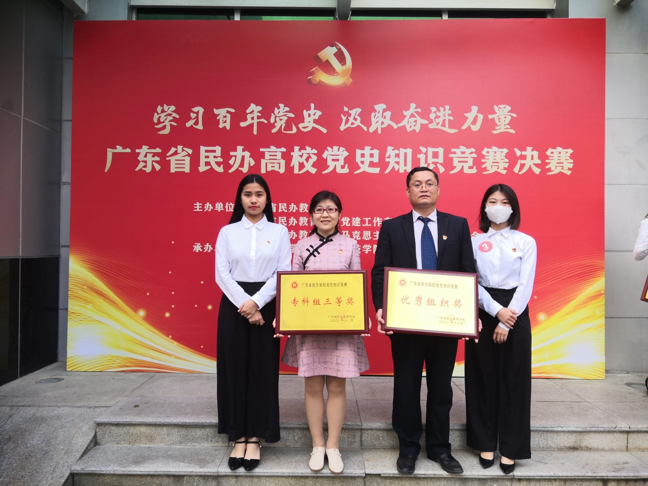 12月 在廣東省民辦高校黨史知識競賽決賽中,我校代表隊(duì)由我院黨總支第一支部書記陳改梅老師和辛婷婷、謝梓婷同學(xué)組成,在激烈的角逐中獲專科組三等獎(jiǎng),同時(shí)獲該項(xiàng)賽事優(yōu)秀組織獎(jiǎng)。我院黨總支代表隊(duì)被評為本次黨史知識競賽“百佳戰(zhàn)隊(duì)”。