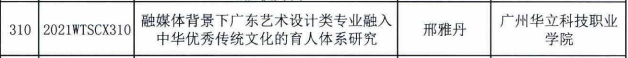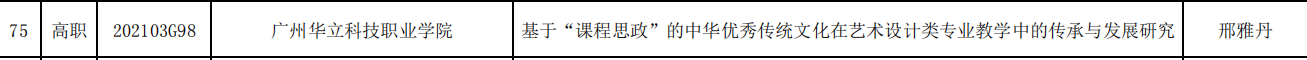 3月 學(xué)校公布《2020-2021學(xué)年校級質(zhì)量工程項(xiàng)目立項(xiàng)結(jié)果的通知》(華立職院教〔2021〕41號),經(jīng)教師個(gè)人申報(bào)、二級學(xué)院推薦、專家評審并公示等程序,我院三項(xiàng)目獲得立項(xiàng)。三位主持人分別是李于昆,宋依謎,張召能(指導(dǎo)教師胡彩霞);3月廣東省職業(yè)技術(shù)教育學(xué)會第四屆理事會科研規(guī)劃項(xiàng)目課題立項(xiàng)1項(xiàng),主持人:邢雅丹;8月2021年度廣東省普通高校重點(diǎn)科研平臺特色創(chuàng)新類項(xiàng)目立項(xiàng)1項(xiàng),主持人:邢雅丹