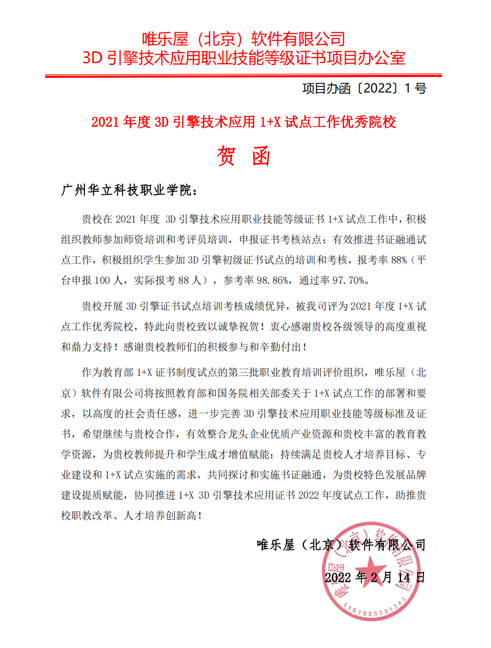 教育部1+X證書制度試點(diǎn)培訓(xùn)評(píng)價(jià)組織賀函