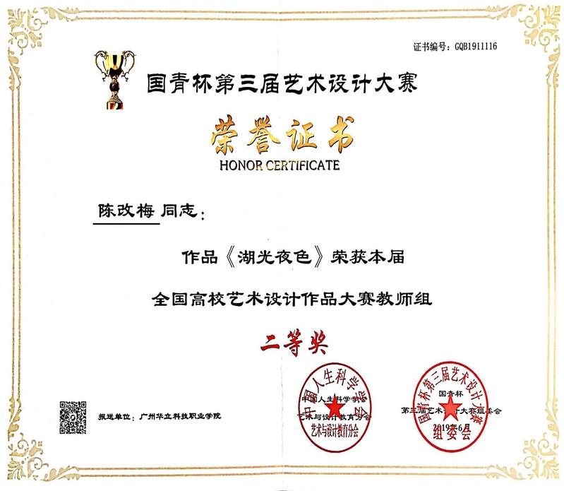 2019年陳改梅老師作品《湖光夜色》榮獲國青杯第三屆全國高校藝術(shù)設(shè)計大賽二等獎