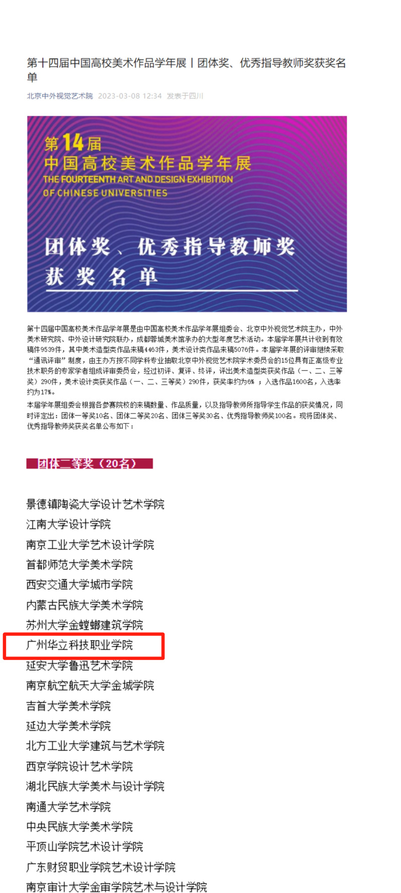 在校領(lǐng)導(dǎo)及各部門的大力支持和指導(dǎo)下,我院通過(guò)向?qū)W校申報(bào)該賽項(xiàng),大力組織和發(fā)動(dòng)學(xué)院師生積極參與,經(jīng)過(guò)我院師生的共同努力,通過(guò)層層篩選,最終推選55項(xiàng)作品參與該賽項(xiàng),經(jīng)過(guò)初評(píng)、復(fù)評(píng)、終評(píng),我院多名師生獲獎(jiǎng),取得了優(yōu)異的成績(jī):我校獲得團(tuán)體賽二等獎(jiǎng);美術(shù)造型類、美術(shù)設(shè)計(jì)類獲獎(jiǎng)(含大學(xué)組、博碩組、教師組)教師組:二等獎(jiǎng)1項(xiàng)、三等獎(jiǎng)2項(xiàng);學(xué)生組:二等獎(jiǎng)3項(xiàng)、三等獎(jiǎng)2項(xiàng)。學(xué)術(shù)論文獲獎(jiǎng):一等獎(jiǎng)1項(xiàng)、二等獎(jiǎng)3項(xiàng)、三等獎(jiǎng)2項(xiàng)。馬俊常務(wù)副校長(zhǎng)、陳改梅副院長(zhǎng)、邢雅丹、劉嘉怡、黎映如、陳舒薇、姜兵、宋海泉、宋依謎、鄧常寧等被評(píng)為優(yōu)秀指導(dǎo)老師。